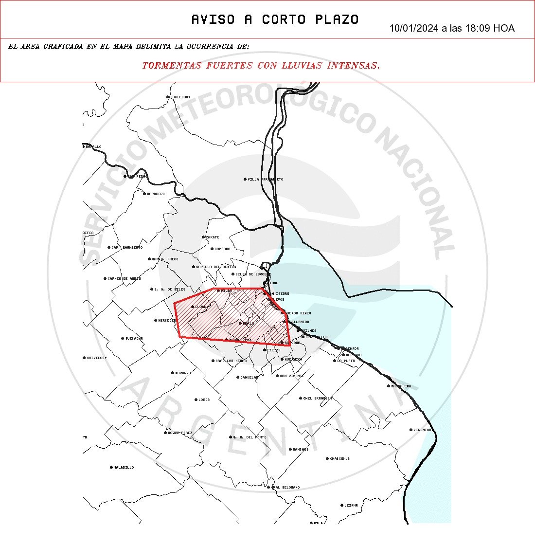 Según el SMN, las tormentas podrían estar acompañadas de ráfagas, actividad eléctrica, ocasional caída de granizo y abundante caída de agua en cortos períodos. El aviso tiene validez hasta las 21:09 horas del día de hoy y abarca los partidos de Almirante Brown, Avellaneda, Escobar, Esteban Echeverría, General Las Heras, General Rodríguez, General San Martín, Hurlingham, Ituzaingó, José C. Paz, La Matanza, Lanús, Lomas de Zamora, Luján, Malvinas Argentinas, Marcos Paz, Merlo, Moreno, Morón, Pilar, San Fernando, San Isidro, San Miguel, Tigre, Tres de Febrero y Vicente López, además de la Ciudad Autónoma de Buenos Aires.