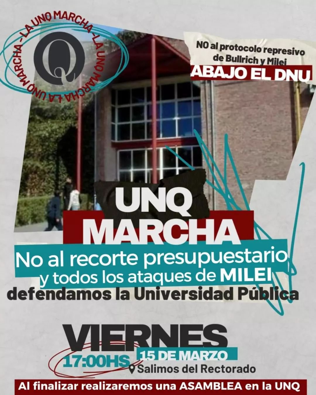 Bajo el lema "UNQ MARCHA: NO AL RECORTE PRESUPUESTARIO Y TODOS LOS ATAQUES DE MILEI - DEFENDAMOS LA UNIVERSIDAD PÚBLICA", los estudiantes se unirán en una caminata por las calles de Bernal. El acto busca hacer eco sobre las adversidades que enfrenta la universidad, en un contexto de medidas económicas que generaron preocupación y rechazo dentro del ámbito académico.