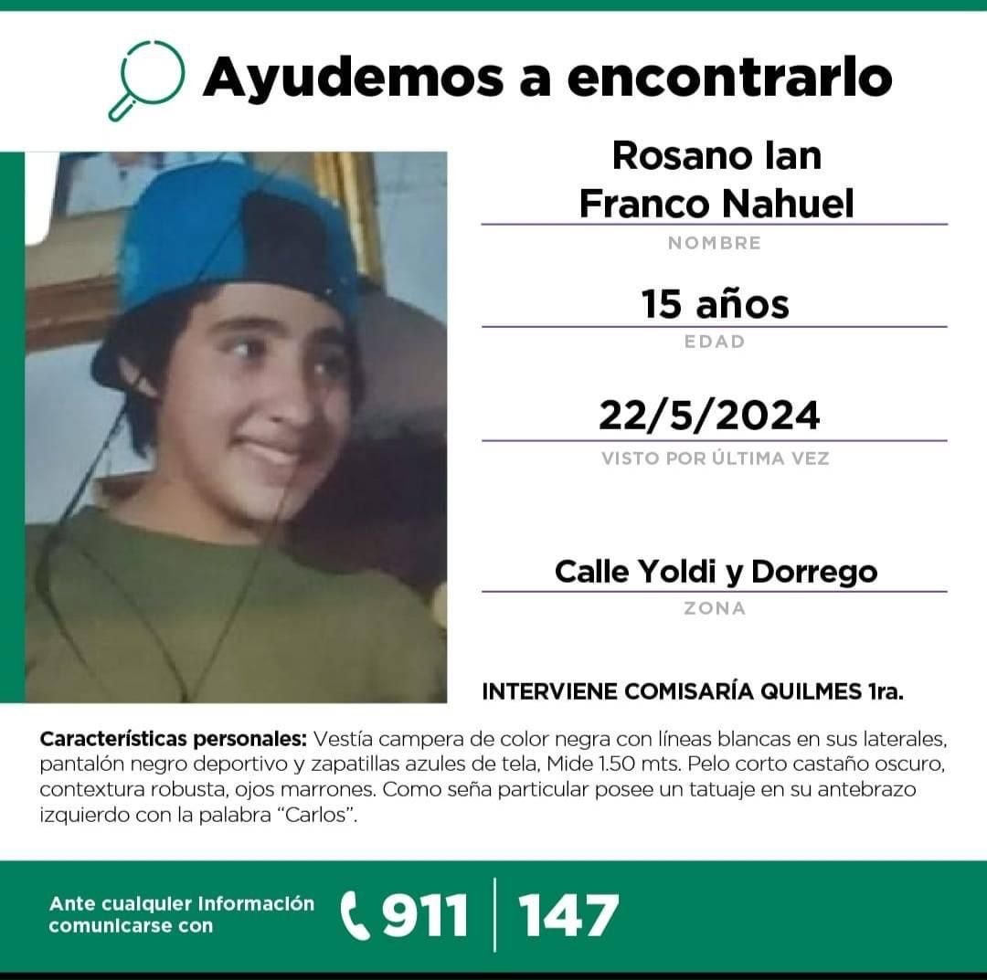 El joven adolescente salió de su hogar ubicado en la calle Yoldi y Dorrego el pasado miércoles y no se supo más de él desde entonces. Familiares, vecinos y amigos han iniciado una campaña de difusión a través de las redes sociales para poder encontrarlo lo antes posible.
