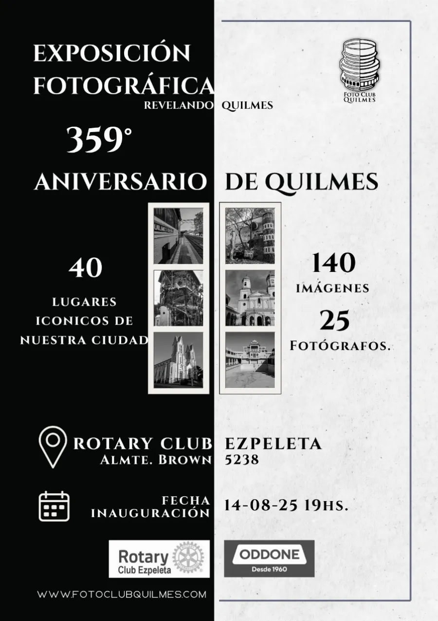La muestra, que se inaugurará el miércoles 14 de agosto a las 19 horas en la sede del Rotary Club de Quilmes (Almirante Brown 5238, Ezpeleta), reúne el trabajo de 26 fotógrafos y fotógrafas socios de la institución, quienes plasmaron con su lente 40 sitios emblemáticos del distrito. Desde rincones históricos hasta paisajes urbanos y espacios icónicos, las obras invitan a redescubrir la identidad quilmeña y a reflexionar sobre la importancia de preservar su patrimonio.