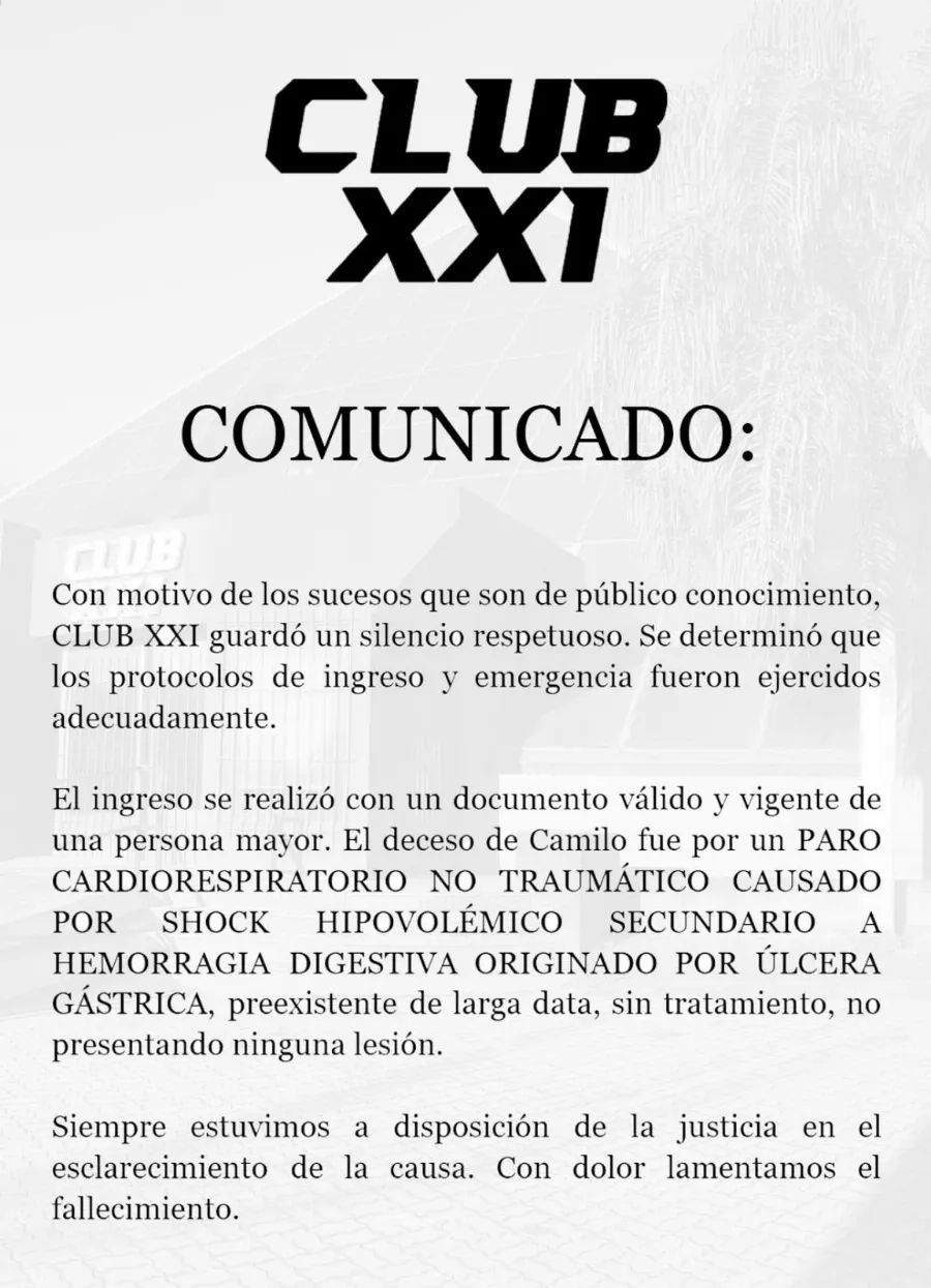 “Con motivos de los sucesos que son de público conocimiento, Club XXI guardó un silencio respetuoso”, inicia el comunicado emitido por el establecimiento. En el mismo, se afirma que los protocolos de ingreso y emergencia “fueron ejercidos adecuadamente” y que el adolescente ingresó con “un documento válido y vigente de una persona mayor”.