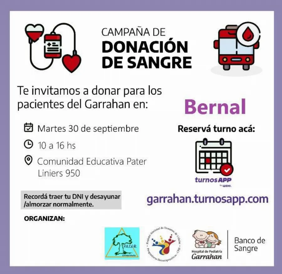 El Instituto Pater de Bernal llevará adelante una colecta de sangre destinada al Hospital de Pediatría Garrahan, una de las instituciones sanitarias más importantes del país en atención infantil. La iniciativa busca sumar donantes voluntarios y concientizar sobre la importancia de este gesto solidario que salva vidas.