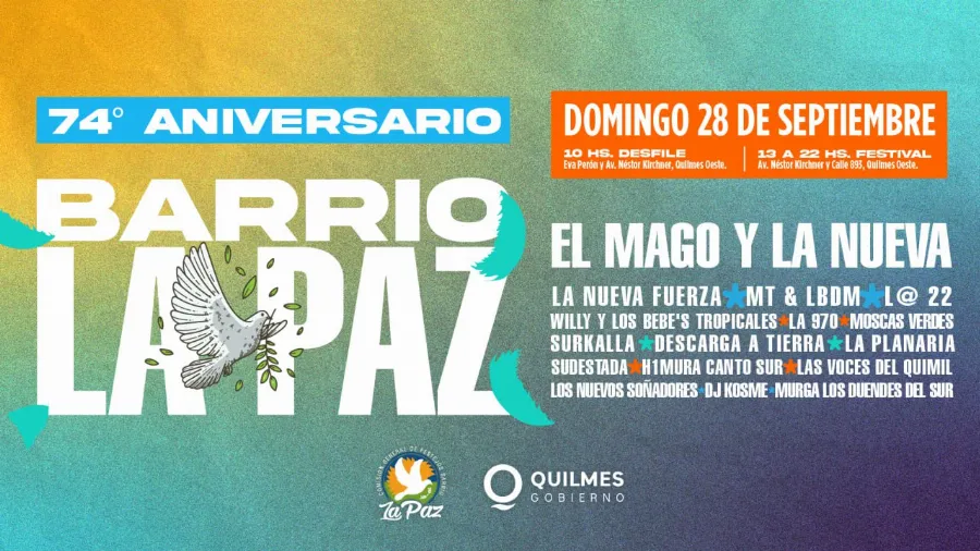 El Municipio de Quilmes invita a los vecinos y vecinas a disfrutar con entrada libre y gratuita, de una nueva edición del “Festival Somos Quilmes”, en el marco de los festejos por el 74º aniversario del barrio La Paz, de Quilmes Oeste, que se llevarán a cabo este domingo 28, en las avenidas Presidente Néstor Kirchner (ex Santa Fe) y Eva Perón (892), con un desfile de instituciones, ferias y shows musicales en vivo, que tendrán un cierre estelar con la presentación de la banda de cumbia El Mago y La Nueva.