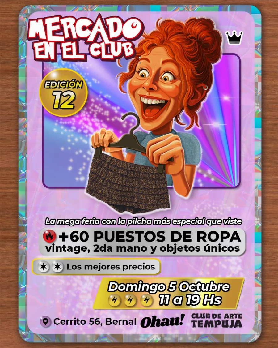El próximo domingo 5 de octubre se realizará en Bernal la 12ª edición del Mercado en el Club, la mega feria vintage que reúne a más de 60 emprendimientos independientes de ropa usada y objetos únicos, consolidándose como un punto de encuentro para los amantes de la moda circular y las compras de segunda mano. El evento tendrá lugar de 11 a 19 horas en el Club de Arte Tempuja, ubicado en Cerrito 56.