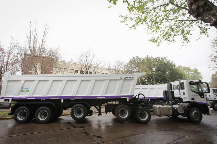 Los nuevos vehículos son cinco camiones con almeja (hidrogrúa con adaptación hidráulica en conjunto con pulpo para residuos tipo chatarreros) y dos camiones con bateas largas, adquiridos con fondos netamente municipales, además de un camión de carga lateral, comprado por leasing del Banco Provincia. A partir de estas incorporaciones, la mencionada área pasó de 69 a 77 vehículos de flota pesada. En relación al camión de carga lateral, es la tercera incorporación del año de estas características junto a 300 contenedores.