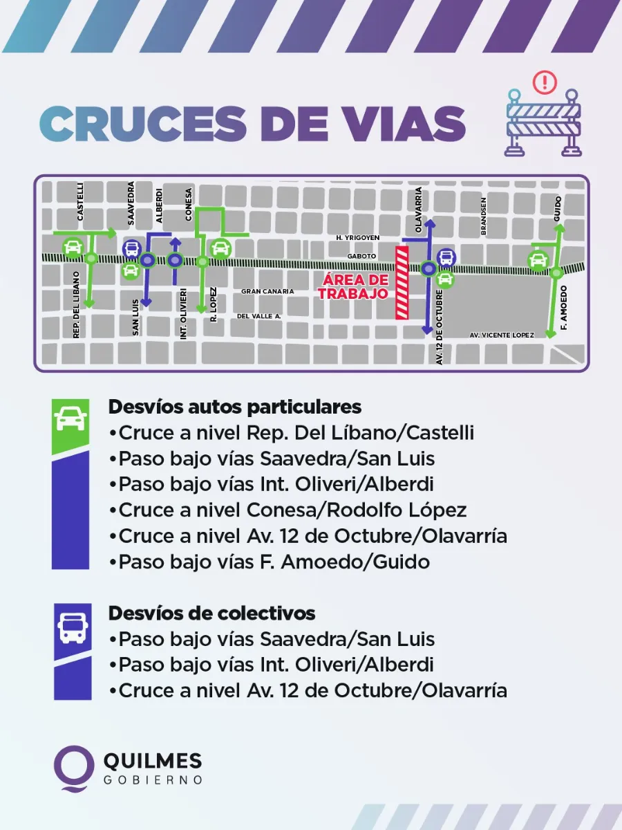El cierre del puente —uno de los principales accesos entre el centro de Quilmes y la zona oeste— generará desvíos obligatorios para los automovilistas, quienes deberán optar por las siguientes alternativas: el cruce a nivel de República del Líbano/Castelli, el paso bajo vías de Saavedra/San Luis, el paso bajo vías de Intendente Oliveri/Alberdi, el cruce a nivel de Conesa/Rodolfo López, el cruce a nivel de avenida 12 de Octubre/Olavarría y el paso bajo vías de Felipe Amoedo/Guido.