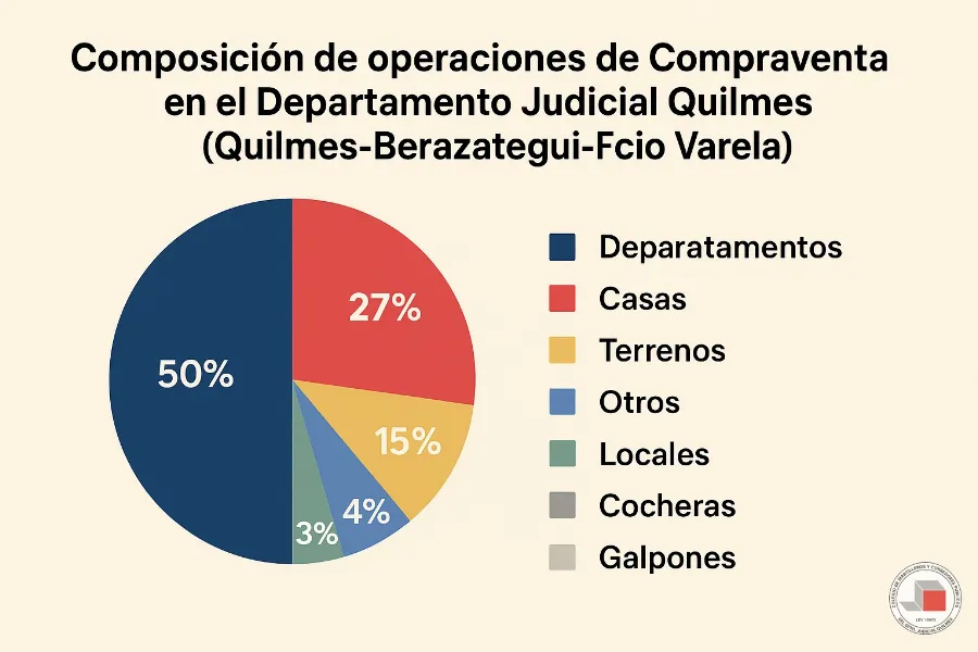 Otro dato relevante del informe elaborado por la UNNOBA y los colegios profesionales inmobiliarios confirma que “la composición de la compraventa de inmuebles en nuestra región está signada casi exclusivamente por las viviendas. Según las estadísticas, la compraventa durante el primer semestre estuvo liderada por los departamentos (50%), seguidos por las casas (27%) y los terrenos (15%). El resto de las operaciones se distribuye entre locales, cocheras, galpones y otros. Los datos son reveladores: el mercado de venta y alquiler en los distritos de Quilmes, Berazategui y Florencio Varela, durante el primer semestre de 2025, estuvo vinculado casi exclusivamente a la adquisición de inmuebles destinados a vivienda”, concluyó Lavalle.