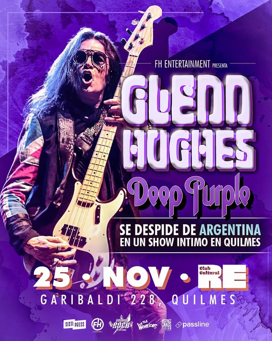 El legendario exintegrante de Deep Purple, Glenn Hughes, ofrecerá un último show en el país con una presentación exclusiva en el Club RE de Quilmes. Será el 25 de noviembre, en el marco de su despedida de la Argentina, luego del éxito de ventas de sus recitales en Buenos Aires.