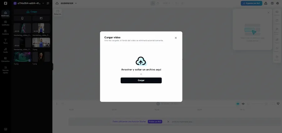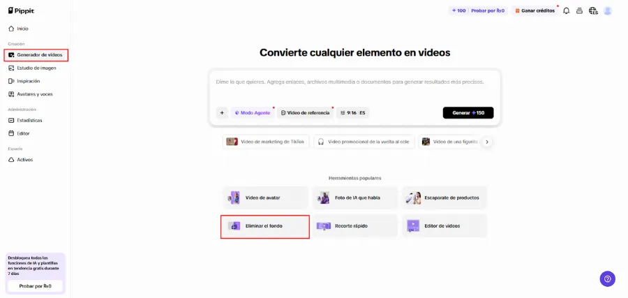Accede al panel de control de Pippit, abre la sección "generador de video" y selecciona "eliminar fondo" en las herramientas populares. Sube tu clip arrastrándolo o soltándolo. Si no hay nada listo para usar, elige un video de stock de la pestaña de elementos para comenzar a construir tu escena virtual.