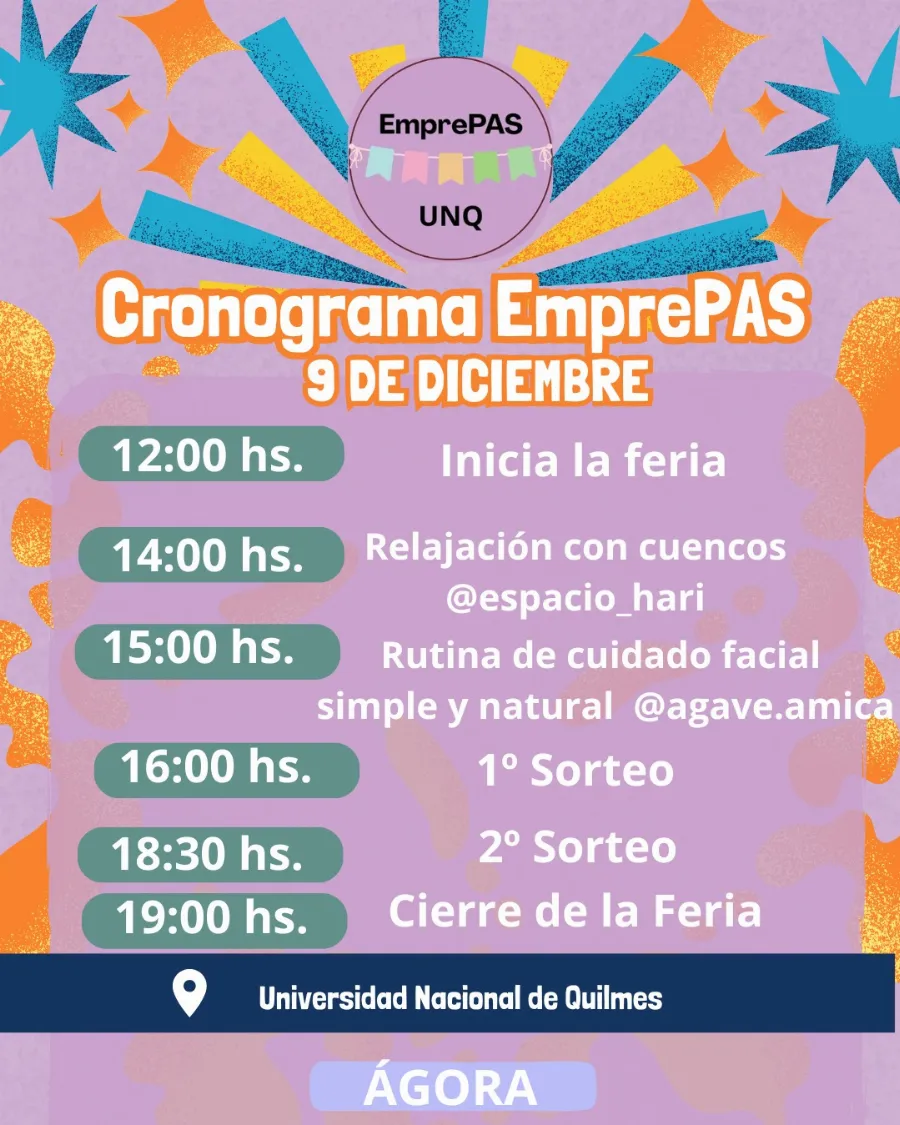 La cita es este martes 9 en Roque Sáenz Peña 352, Bernal, en el espacio del patio central Ágora de la UNQ. Arriban las líneas de colectivo 324, 263, 98, 85 y 159. La universidad se encuentra a tres cuadras de la estación Bernal del tren Roca. Más información se puede encontrar en Instagram: @emprepasunq