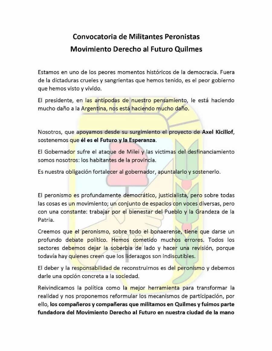 Finalmente, el espacio insta a la militancia a involucrarse en las próximas elecciones internas de marzo, a las que consideran una herramienta clave para “volver a las bases”, escuchar a los vecinos y revitalizar las unidades básicas. “Quilmes necesita un peronismo que abrace al pueblo y reconstruya el sueño colectivo de una patria justa, libre y soberana”, concluye el texto, reafirmando la “conducción indiscutida de Axel Kicillof”.