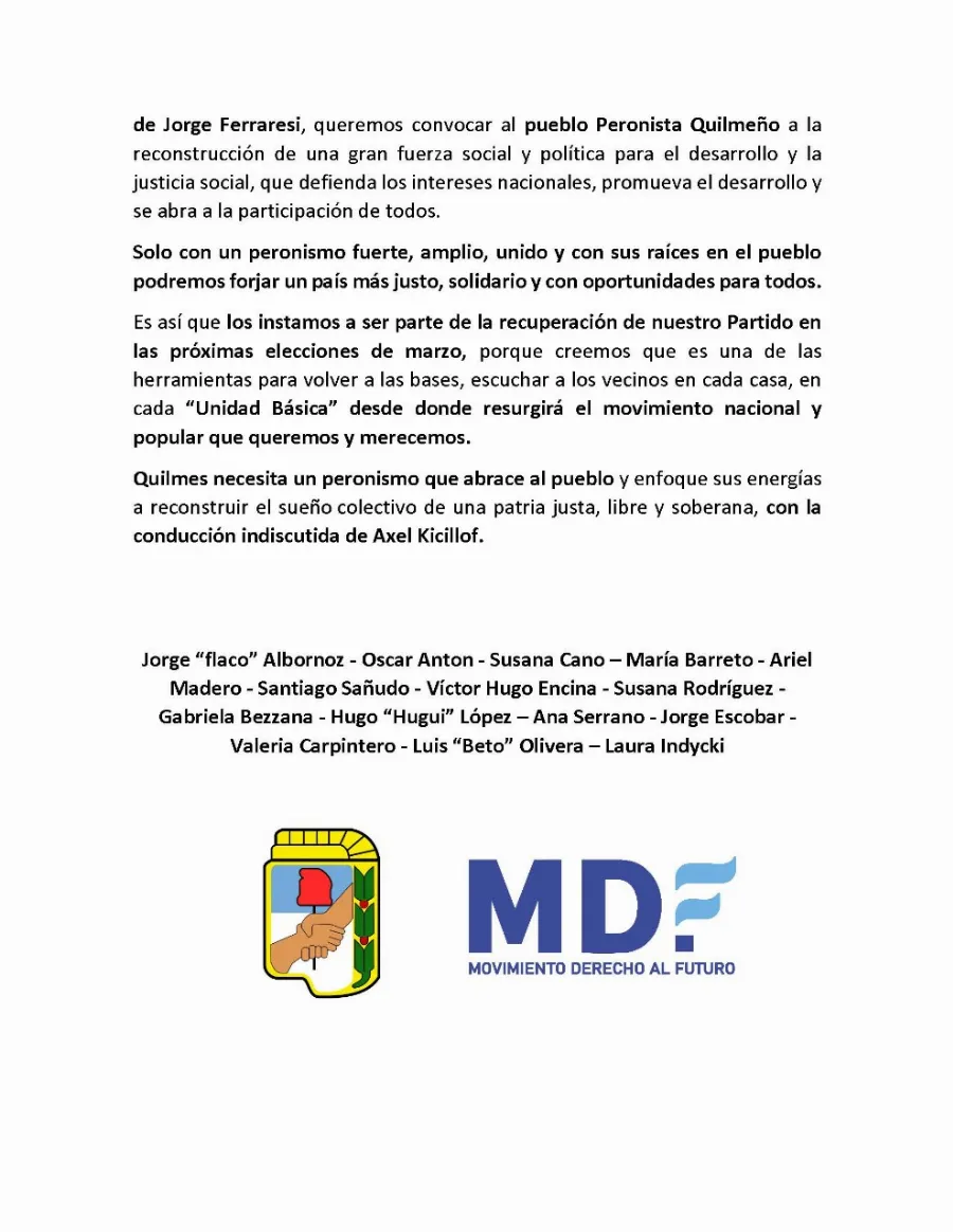 En ese marco, reivindican la política como herramienta de transformación social y proponen reformular los mecanismos de participación. Desde Quilmes, recuerdan que fueron parte fundadora del Movimiento Derecho al Futuro en la ciudad, de la mano de Jorge Ferraresi, y convocan al pueblo peronista quilmeño a reconstruir una gran fuerza social y política que defienda los intereses nacionales, promueva el desarrollo y la justicia social, y se abra a la participación de todos los sectores.
