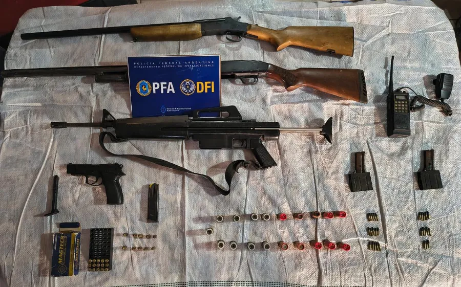 Durante los procedimientos, los efectivos federales detuvieron al imputado y secuestraron un importante arsenal y material de interés para la causa, entre ellos 317 dosis de clorhidrato de cocaína, decenas de envoltorios de droga sintética, dos escopetas calibre 12, una carabina calibre 22 con dos cargadores, municiones de distintos calibres, un cargador de pistola 9 mm vacío, una réplica de pistola 9 mm, 19 cartuchos de escopeta, un teléfono celular, un equipo de comunicaciones tipo HT, una cédula del automotor, dos boletos de compra-venta correspondientes al camión que dio origen a la investigación, elementos de corte y diversa documentación relevante.