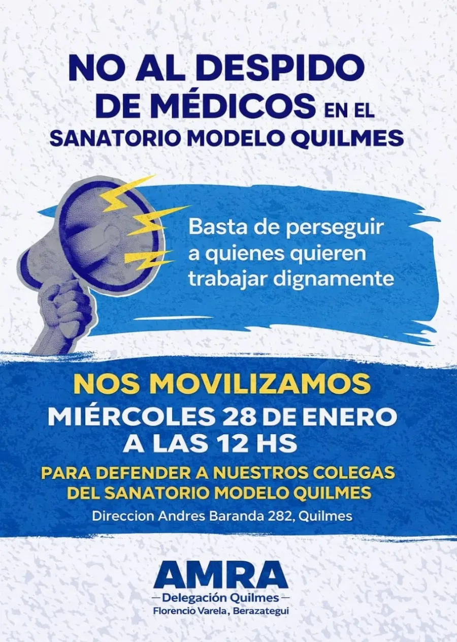 El Sindicato Médico AMRA anunció que el próximo miércoles al mediodía realizará una movilización frente al Sanatorio Modelo de Quilmes en reclamo por el despido de dos trabajadores, quienes —según denuncian— fueron desvinculados sin causa durante la semana pasada.