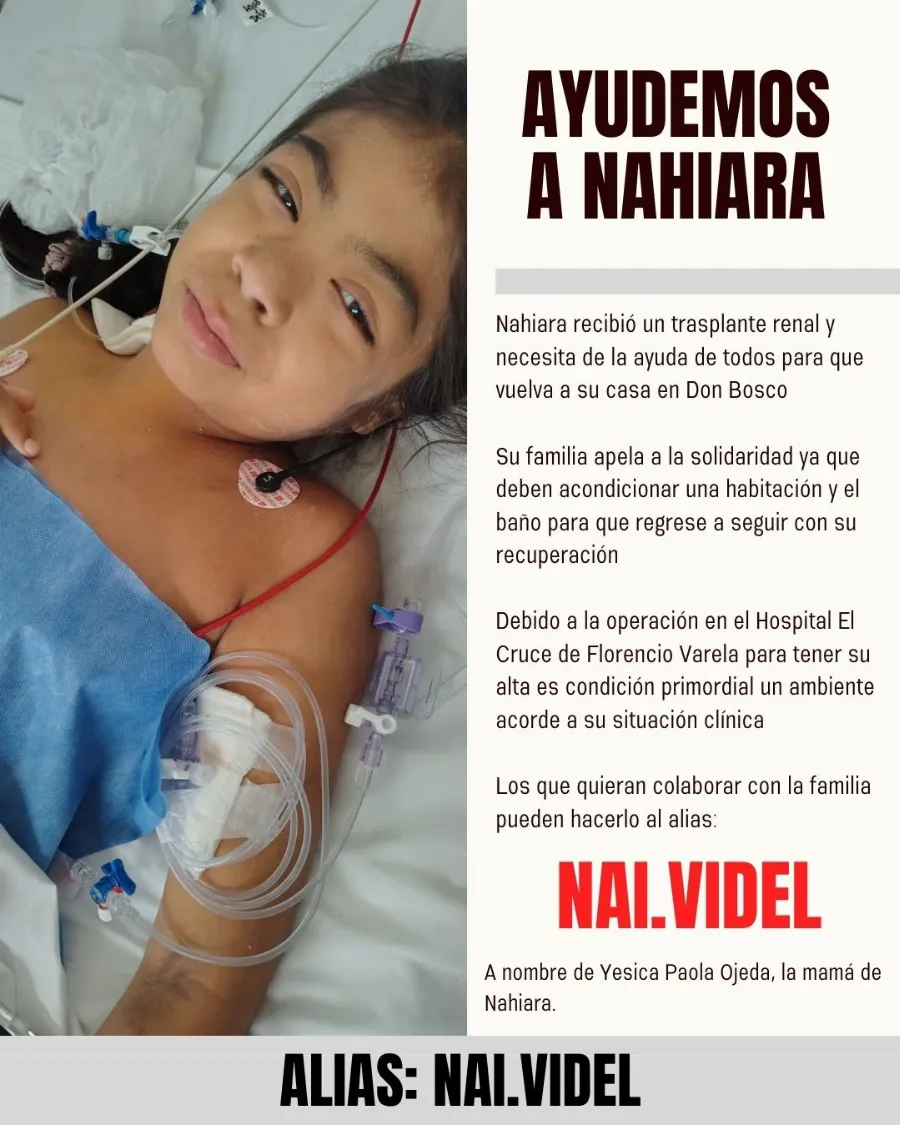 Nahiara Gómez recibió la semana pasada un trasplante renal en el Hospital El Cruce de Florencio Varela, se recupera favorablemente y para recibir el alta su familia necesita acondicionar su habitación y el baño de la vivienda en Don Bosco; como también levantar el piso por la humedad que afectaría su cuadro clínico. Es una condición esencial para que continúe su recuperación, por tal motivo, su mamá Yésica apela a la solidaridad de quienes puedan ayudar a esta familia y mejorar la calidad de vida de Nahiara.